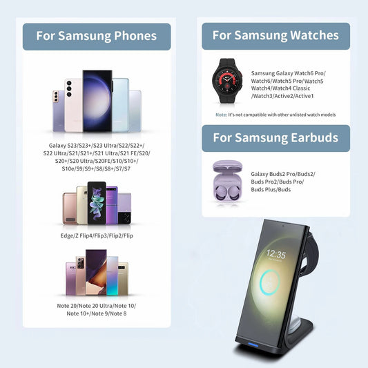 Wireless Charger 3 in 1 Fast Charging Dock Station- Samsung S23 S22, Galaxy Watch 6 5 4 Buds 2 Pro